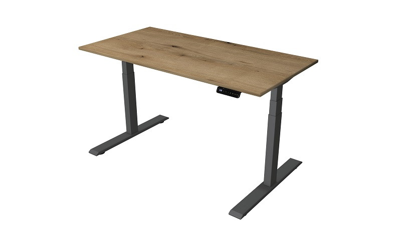 Massives T-Fuß Gestell mit Stellfüßen, in Alusilber oder Anthrazit. Elektrische Höhenverstellung bis 127cm mit einer Hubgeschwindigkeit von 35mm/Sek. Hoch belastbar (100kg statisch und 70kg dynamisch).