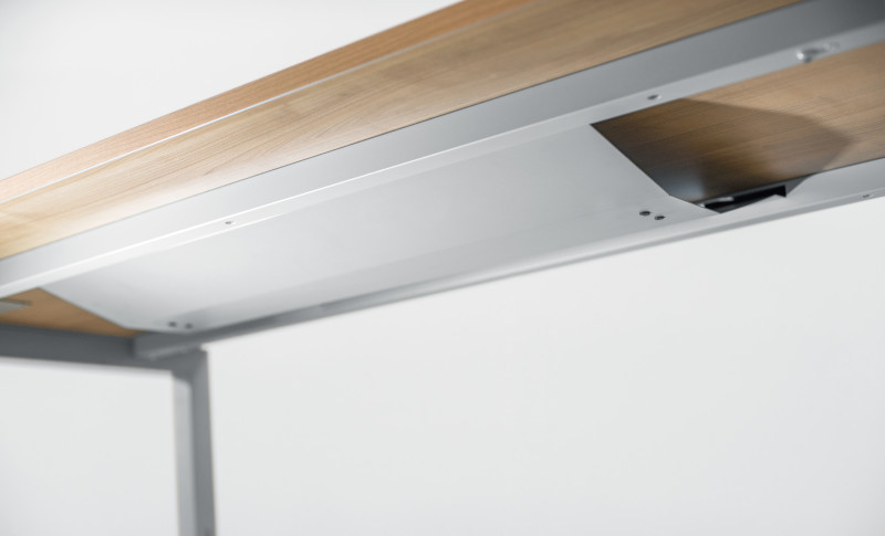 Große Kabelwanne zum horizontalen Unterbau für alle Schreibtische der Serien ROM und Jaipur. Zur Bestückung kann die Kabelwanne auf- / und zugeklappt werden. Die Abbildungen zeigen jeweils eine aufgeklappte sowie eine geschlossene Wanne.
