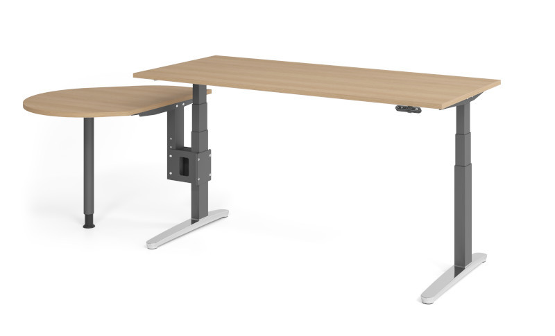 Schreibtischkombination bestehend aus einem elektrisch höhenverstellbaren Schreibtisch der mit einem speziellen Ansatztisch in Tropfenform (102cm Tiefe) verbunden ist. Die Ansatzkonsole kann sowohl auf der rechten, als auch auf der linken Seite angebracht werden.