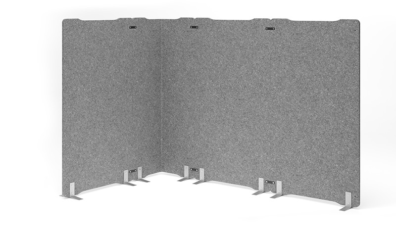 Rahmenlose Konstruktion mit Schallschutzflies, grau meliert in Filzoptik (25mm dick). Metallfüße in Silber, freistehend und flexibel einsetzbar.